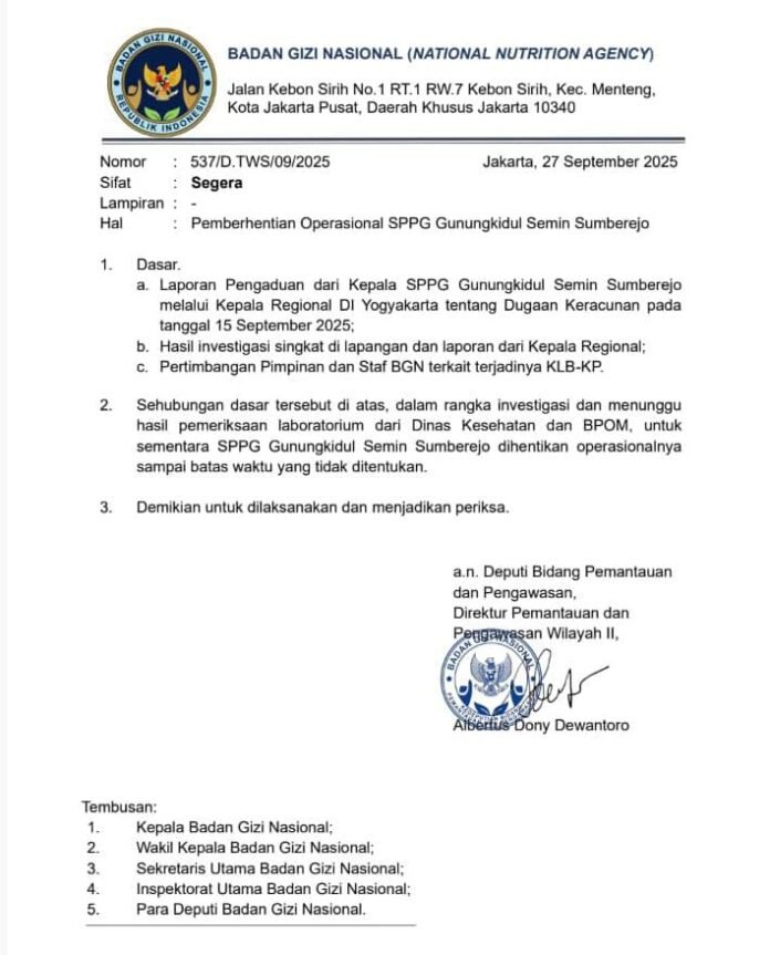 GUNUNGKIDUL,ungkaprealita.com— Badan Gizi Nasional menghentikan operasional dapur satuan pelayanan penyedia gizi SPPG di Sumberjo Kapanewon Semin, Gunungkidul, D.I. Yogyakarta. Pemberhentian ini menyusul peristiwa keracunan yang menimpa 19 siswa beberapa waktu lalu.
