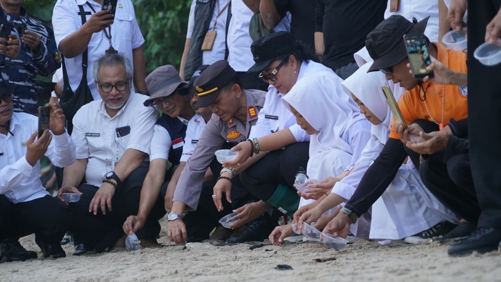 Demi melindungi penyu dari kepunahan, sejumlah masyarakat bersama dengan Bupati Gunungkidul, Dinas Kelautan dan Perikanan Provinsi DIY serta pihak terkait lainnya, melepasliarkan 101 tukik tersebut di Pantai Wediombo, Jepitu, Kapanewon Girisubo, Kabupaten Gunungkidul pada Rabu, (4/6/2025). tempat dimana sebelumnya telur penyu ditemukan.